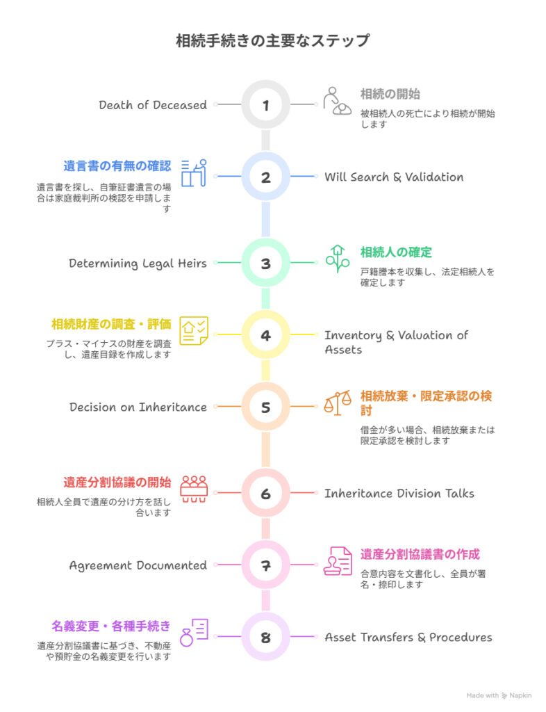 遺産分割協議は、相続開始から遺産が最終的に各相続人に帰属するまで、いくつかのステップを経て進行します。具体的な流れと、それに要する期間の目安を理解しておくことは、スムーズな協議のために不可欠です。